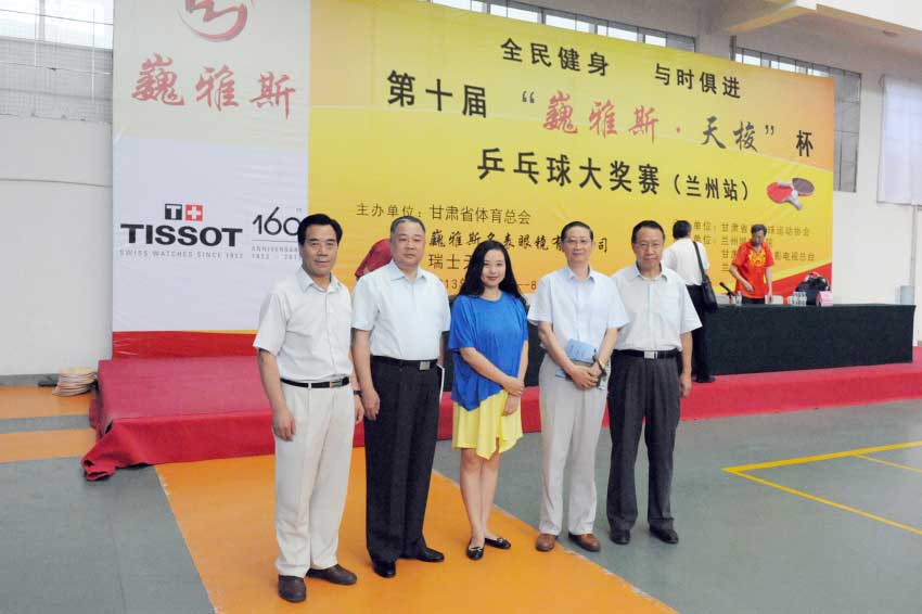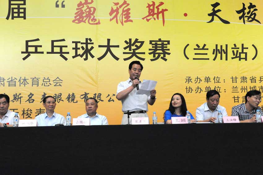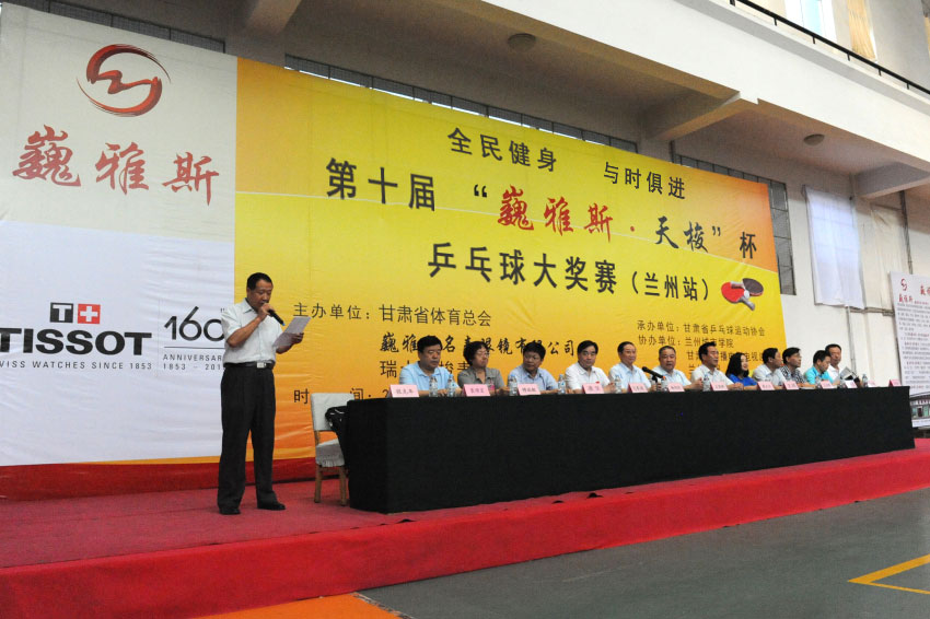 8月15日上午,在蘭州城市學(xué)院培黎校區(qū)體育館,備受社會(huì)各界關(guān)注的體育比賽——第十屆“巍雅斯·天梭”杯乒乓球大獎(jiǎng)賽(蘭州站),在超千名運(yùn)動(dòng)員及體育愛好者的歡呼聲中正式拉開帷幕。此次大獎(jiǎng)賽由甘肅省體育總會(huì)、巍雅斯名表眼鏡有限公司和瑞士天梭表主辦,甘肅省乒乓球協(xié)會(huì)承辦,蘭州城市學(xué)院、甘肅省廣播電影電視總臺(tái)、蘭州晨報(bào)協(xié)辦。應(yīng)邀出席當(dāng)天活動(dòng)的領(lǐng)導(dǎo)及嘉賓有:蘭州軍區(qū)黨委常委、蘭州軍區(qū)聯(lián)勤部部長(zhǎng)、原蘭州軍區(qū)副參謀長(zhǎng)楊旭華、甘肅省廣播電影電視總臺(tái)總臺(tái)長(zhǎng)康堅(jiān)、蘭州城市學(xué)院院長(zhǎng)王汝峰、中國(guó)鐘表商會(huì)副會(huì)長(zhǎng)、甘肅省眼鏡協(xié)會(huì)會(huì)長(zhǎng)、甘肅省乒協(xié)副主席、巍雅斯名表眼鏡有限公司董事長(zhǎng)裴正江、瑞士天梭表中國(guó)區(qū)副總裁王穎、甘肅省司法廳巡視員、甘肅省乒協(xié)副主席張克年、甘肅省乒乓球運(yùn)動(dòng)協(xié)會(huì)主席穆端敏、甘肅省體育局副局長(zhǎng)馬賽敏、甘肅省廣播電影電視總臺(tái)副臺(tái)長(zhǎng)王小樞、蘭州晨報(bào)社總編輯周丹波、甘肅省體育總會(huì)常務(wù)副秘書長(zhǎng)丁思林等領(lǐng)導(dǎo)。開幕式由甘肅省司法廳巡視員、甘肅省乒協(xié)副主席張克年主持。